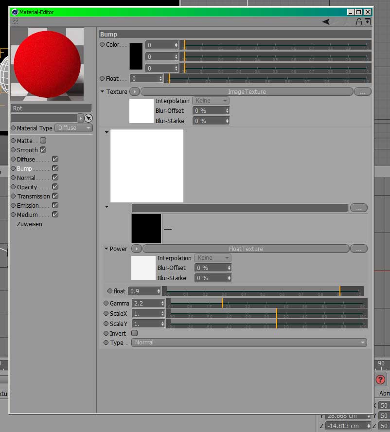 Neben Power ist ein kleines Dreieck, welches die Shader öffnet. Daneben "Floattextur". Klicke ich darauf, dann habe ich "Float" als Schieber, der schon auf 0.9 steht. Und nur noch bis 1.0 geht. Meinst du das? Wenn ja, ist das ganz schön wenig, um dem Bump etwas auf die Beine zu helfen...